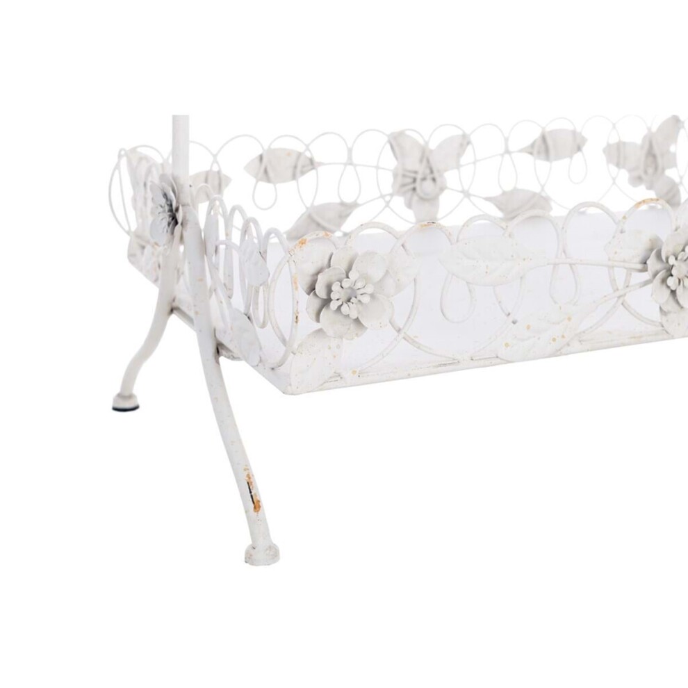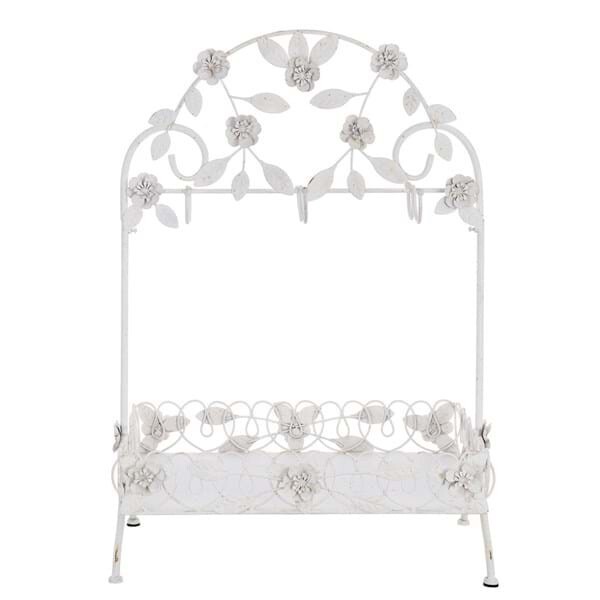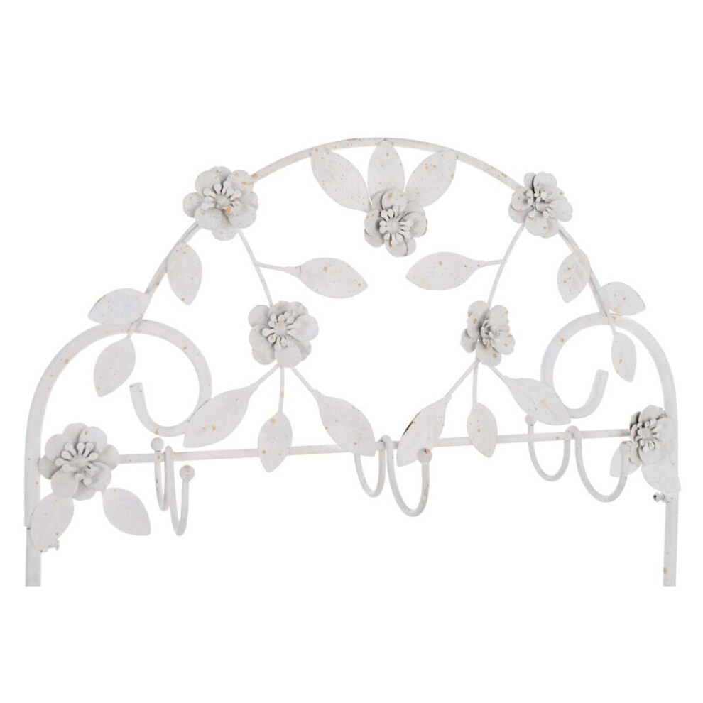 Выполнена из металла, в эмали молочного цвета с вкраплением винтажного эффекта, с шестью крючками для подвесов. Обрамлена листьями и цветами. Обрамление выполнено из тонкого металла, что придает изящности извивающимся листьям и цветам.