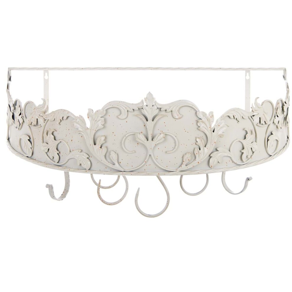 Полка металлическая с крючками. Выполнена в эмали молочного цвета с вкраплением винтажного эффекта.